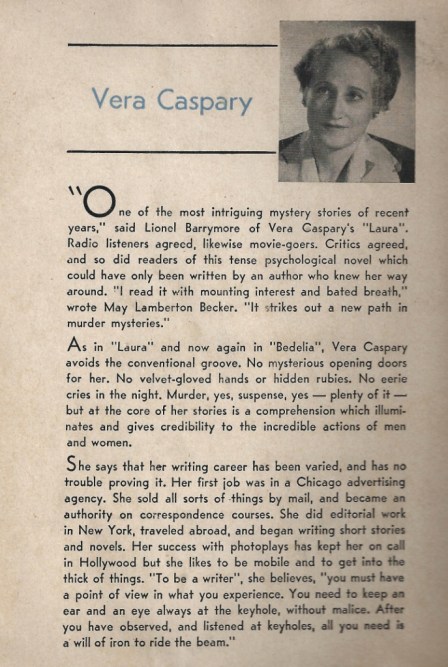 I was curious enough about Caspary and her referenced previous novel Laura (apparently made into a very successful movie, which I confess I have never heard of before) to do a bit of internet research on her.