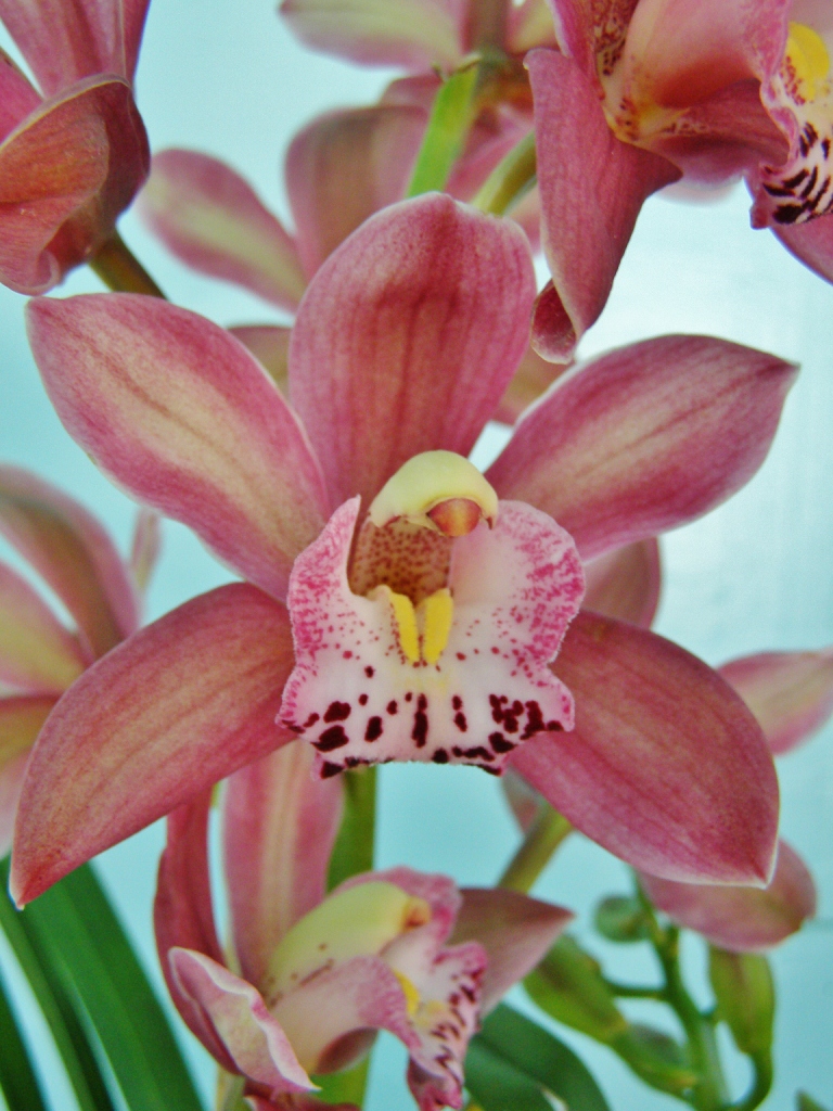 And this is what inspired me to pick up this book, after a Rex Stout hiatus of years. My sister, who recently celebrated a milestone birthday, is fond of orchids and has quite decent luck in keeping them happy and blooming, which can be something of a challenge. As a birthday gift, I gave her this handsome Cymbidium in full bloom, and, as I photographed it against the aqua walls of our newly painted enclosed porch, its temporary home awaiting the birthday party, I suddenly thought of orchidphile extraordinaire Nero Wolfe.