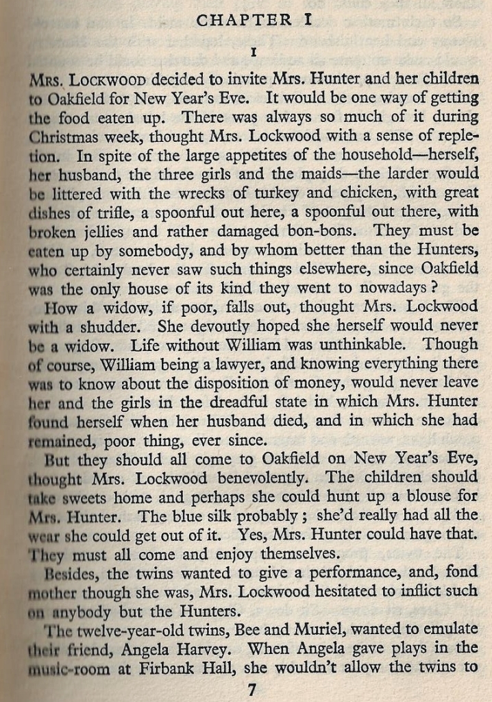 Shortly after the end of the Great War, meek Mrs. Hunter, an architect’s wife, is suddenly left a widow with three young children, and who should she turn to but her husband’s business acquaintance, lawyer Mr. Lockwood, for help with her affairs. Mr. Lockwood, fully occupied with feathering his own nest and the care and nurturing of his beloved wife and three daughters, rolls his eyes and sorts things out in a resentful way. While going through the late Mr. Hunter’s papers, Mr. Lockwood comes upon a situation which he can twist to benefit himself to the detriment of the surviving Hunters; he immediately does so, and the stage is set for our emotionally heart-rending story.