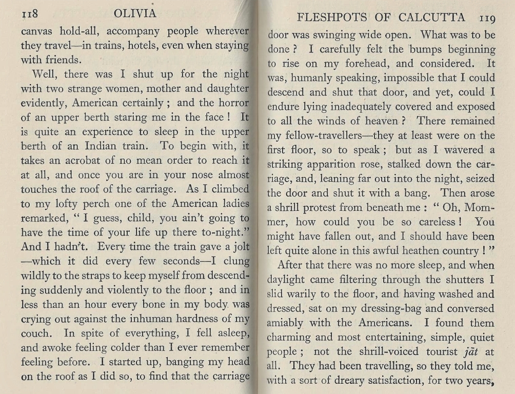 Though it sounds as if I were damning this quiet book with faint praise, it wasn’t actually all that bad. The scenes throughout are engagingly described and occasional vignettes stand out, as when Olivia sees the Himalayas for the first time, after a less-than-comfortable train journey.