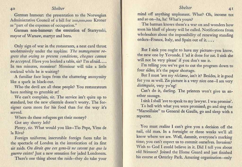 I followed my reading of Frances Faviell’s superb London Blitz memoir, A Chelsea Concerto, with this rather unusually structured novel covering the exact same time period, in the same London borough.