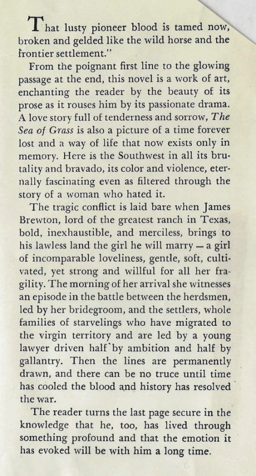 Narrated by a nephew of the leading male character, this novel – novella? – is passionately presented, though sketchy on background details. It reads like the screenplay for a old-style Western movie, and by golly! – lookie there – it was indeed filmed, in 1947, with Katharine Hepburn playing erring wife Lutie, and Spencer Tracy the stoic cattle baron James Brewton.