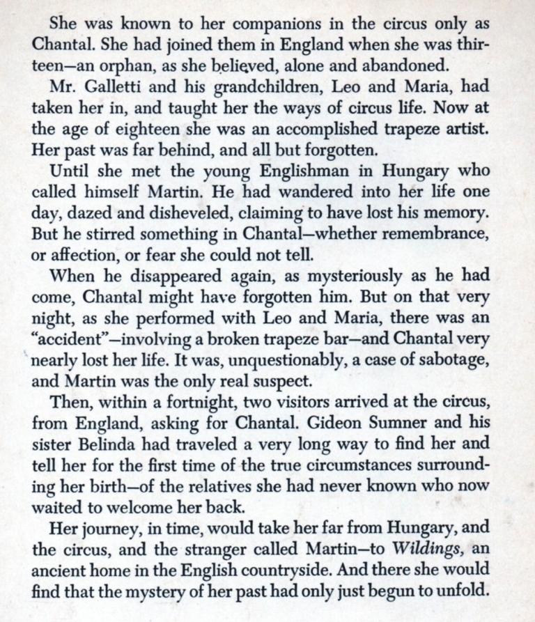 Here is a tale of charm and adventure – set in Europe around the turn of the century – whose colorful action ranges from a touring circus in Hungary to the fox-hunting society of the English countryside to the elegant circles of wealth and fashion in London. It is the story of a spirited young woman of eighteen who has left an unhappy, uncertain past in England and made a new life for herself as a trapeze artist in a small touring circus…But that forgotten past will stumble upon her one day, beside a stream in Hungary, where the circus has pitched its tents for a time. It will come in the form of a mysterious young man – handsome, appealing, yet curiously remote – whose appearance is the beginning of a strange, dangerous intrigue that involves deception, romance, disappearance and, in the end, the revelations of a family’s darkest secrets.