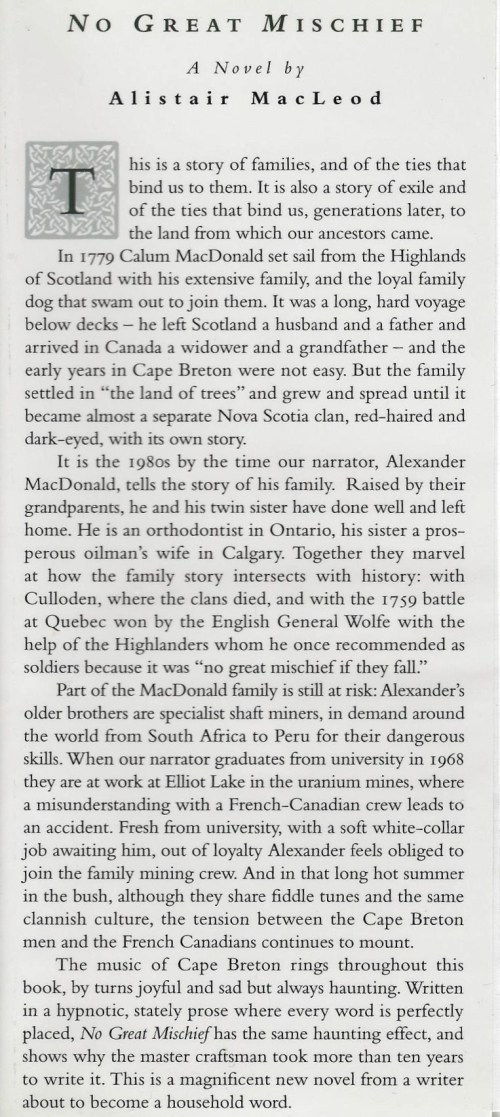No Great Mischief by Alistair MacLeod ~ 1999. This edition: McClelland and Stuart, 1999. Hardcover. ISBN: 0-7710-5567-6. 283 pages.