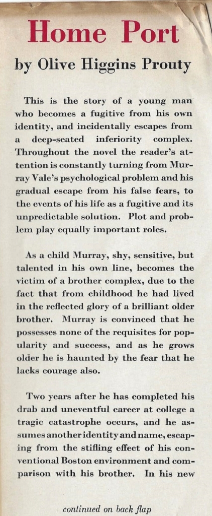 Olive Higgins Prouty was deeply interested in psychology and psychotherapy, and her books are reportedly very much about the emotional lives of her characters, and their rehabilitation from various states of mental imbalance through various therapeutic experiences, not necessarily involving “professional” intervention, but rather organically through positive life experiences and such. Or that is my understanding, in particular from my reading of Home Port, which is all about the emotional trauma and healing of its key character, Murray Vale.