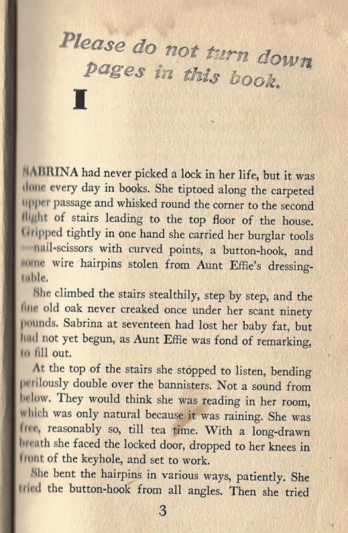 Sabrina finds herself fascinated by the locked room which belongs to the absent Hilary; she goes so far as to pick the lock to gain entry, and the room becomes her almost-secret retreat. “Almost”, because tight-lipped, apparently unemotional Mrs. Pilton, the longtime housekeeper of Nun’s Farthing who stays on to oversee the renters, secretly hands over the room’s key to Sabrina, giving her the nod to go in and while away her long days curled up in the sunny window seat, reading her way through Hilary’s large collection of books.