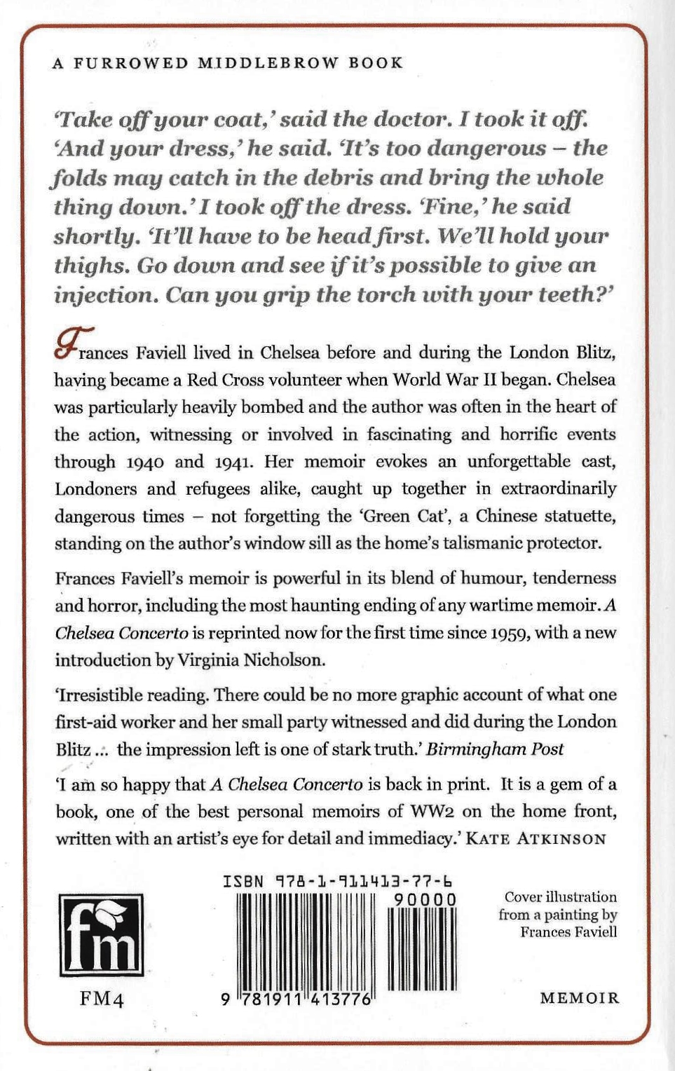 If I can leave you with a final thought, it is that though this is a deeply sad book – so many people die, or go through heart-rending extremities of loss – it is also a supremely likeable memoir. Frances Faviell, along with her precise and analytical artist’s eye, possessed a strong if slightly caustic sense of humour, and also a certain understanding kindness of observation of her fellow-man which makes A Chelsea Concerto something a little bit extra in its class.